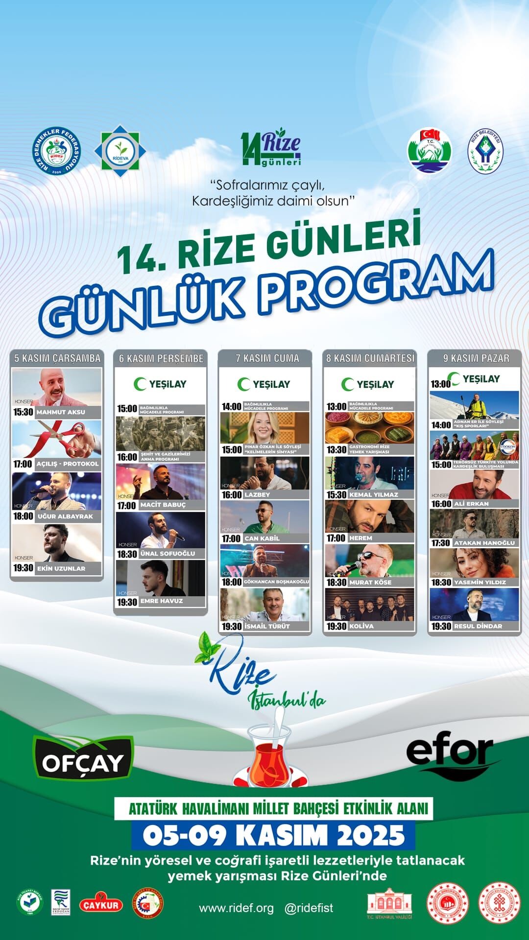14. Rize Günleri Başlıyor: Kardeşlik, Kültür ve Müzik İstanbul’da Buluşuyor. Rize Valiliği himayesinde, Rize Dernekler Federasyonu (RİDEF) organizasyonuyla düzenlenen 14. Rize Günleri, 5–9 Kasım 2025 tarihleri arasında Atatürk Havalimanı Millet Bahçesi Etkinlik Alanı’nda gerçekleştirilecek.