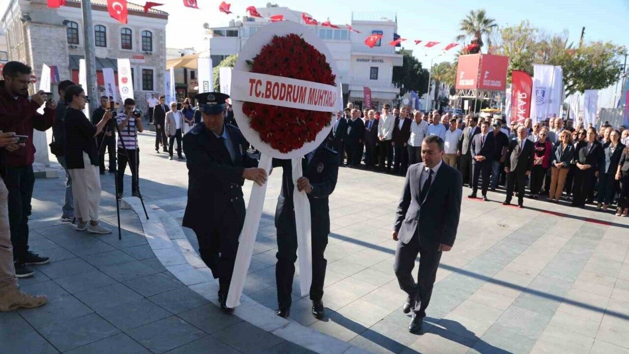 Bodrum Muhtarlar Derneği Başkanı Ahmet Cemil Gündüz’ün Bodrum Muhtarlar Derneği Çelenk sunumuyla başlayan tören, saygı duruşu ve İstiklal Marşı’nın okunmasıyla devam etti.