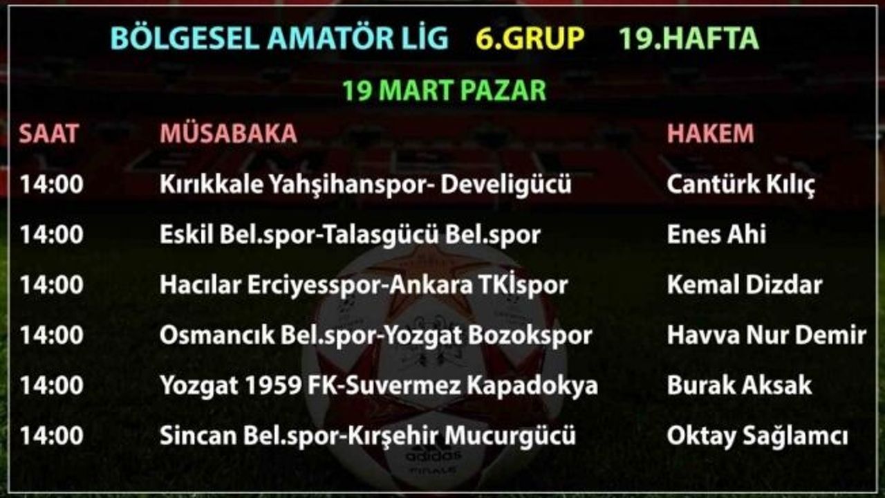 Bölgesel Amatör Lig 6. Grup 19. hafta maçlarında düdük çalacak hakemler ise şu şekilde:
