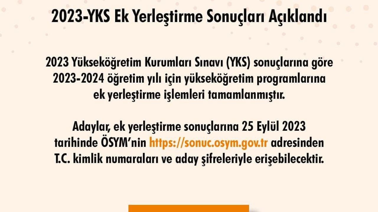 Ölçme, Seçme ve Yerleştirme Merkezi (ÖSYM) Başkanlığı tarafından, 2023 Yükseköğretim Kurumları Sınavı (2023-YKS) ek yerleştirme sonuçları açıklandı.