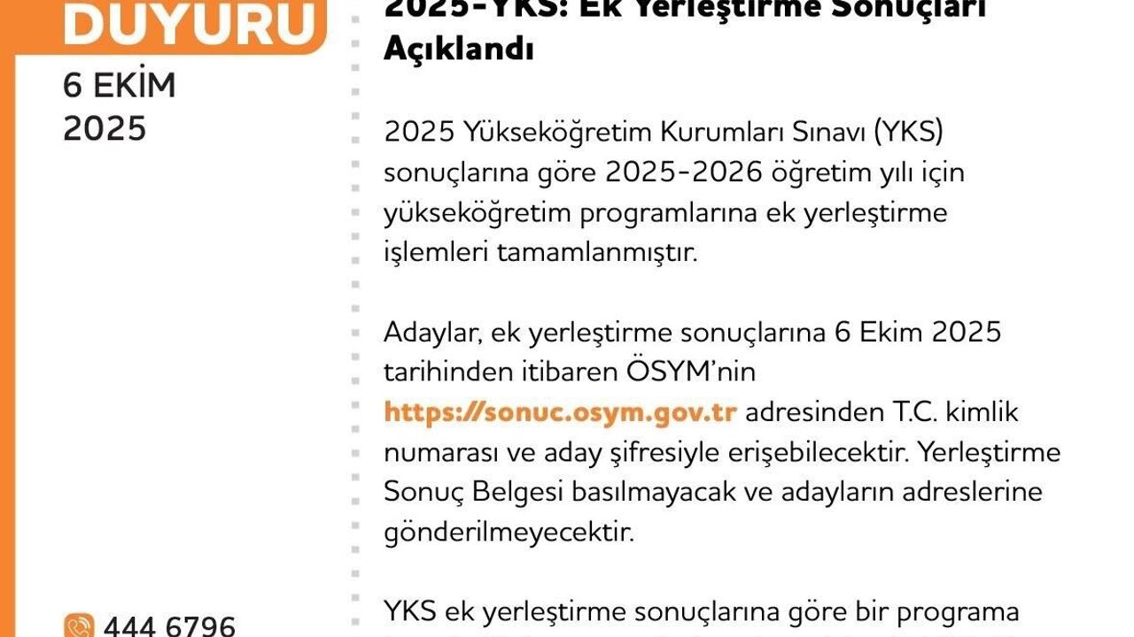 2025 YKS ek yerleştirme sonuçları, Öğrenci Seçme ve Yerleştirme Merkezi (ÖSYM) sitesinde açıklandı. Adayların, ek yerleştirme sonuçlarına 6 Ekim 2025 tarihinde saat 16.30’dan itibaren ÖSYM’nin resmi sitesinden T.C. kimlik numarası ve aday şifresiyle erişebilecekleri belirtildi.