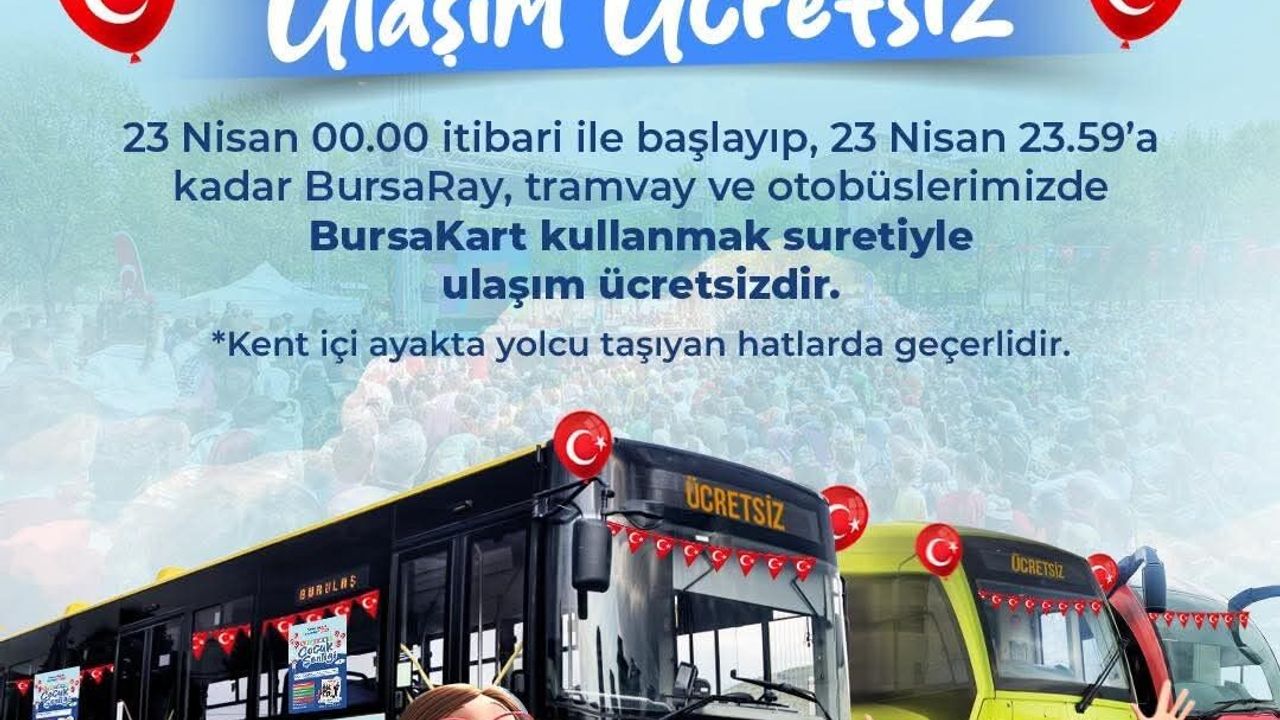 Bursa Büyükşehir Belediyesi, 23 Nisan Ulusal Egemenlik ve Çocuk Bayramı kutlama ve etkinliklerinin coşkulu kalabalıklarla yapılabilmesi için kent içinde ayakta yolcu taşıyan BursaRay, tramvay ve otobüs hatlarının 23 Nisan günü 00.00 ile 23.59 saatleri arasında BursaKart kullanmak suretiyle ücretsiz olarak hizmet vereceğini açıkladı.