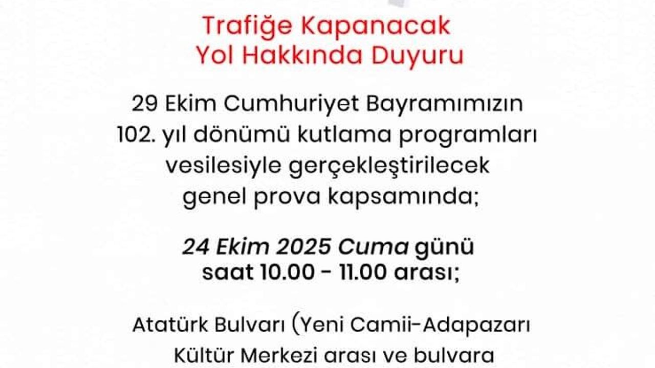 Sakarya Valiliği tarafından yapılan açıklamada, "29 Ekim Cumhuriyet Bayramımızın 102. yıl dönümü kutlama programları vesilesiyle gerçekleştirilecek genel prova çerçevesinde 24 Ekim Cuma günü Atatürk Bulvarı çift yönlü olarak araç trafiğine kapatılacaktır" ifadelerine yer verildi.