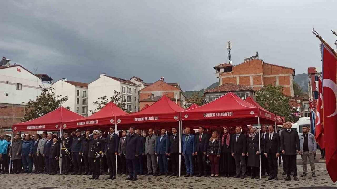 Cumhuriyet Alanında düzenlenen programa Devrek Kaymakamı Onur Alp Bıçakçı, Garnizon Komutanı Öğretmen Yüzbaşı Aykut Erdoğan ve Belediye Başkanı Özcan Ulupınar tarafından anıta çelenk sunumu ile başlanırken, çelenk sunumunun ardından saygı duruşu ve İstiklal Marşının okunmasının ardından tören sona erdi.