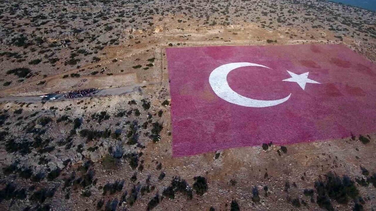 Mersin’in Mut ilçesinde doğa tutkunları, dağ yamacında yer alan dünyanın zemine işli en büyük Türk bayrağına yürüyüş gerçekleştirerek, 29 Ekim Cumhuriyet Bayramı’nın 100’üncü yılını kutladı