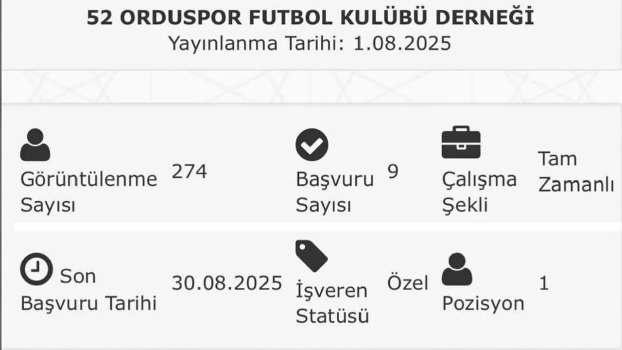TFF 3. Lig takımlarından 52 Orduspor, benzerine az rastlanan bir uygulamayla sosyal medyada gündem oldu. Kulüp, İŞKUR’a futbolcu ilanı verdi. İŞKUR’dan iş arama bölümüne giren kullanıcılar iş ilanı arama yerine futbolcu yazınca 52 Orduspor’un ilanıyla karşılaştı. 1 Ağustos 2025 tarihinde yayınlanan ilanın son başvuru tarihi ise 30 Ağustos 2025 olarak belirlendi. İlanı 274 kişi görüntülerken, 9 kişi başvuru yaptı ancak ilan bir süre sonra kaldırıldı. Bu durumun, geçen yıllarda farklı kulüplerin de yaptığı bir uygulama olduğu, SGK teşvikinden yararlanmak adına yapılan bir işlem olabileceği tahmin ediliyor.