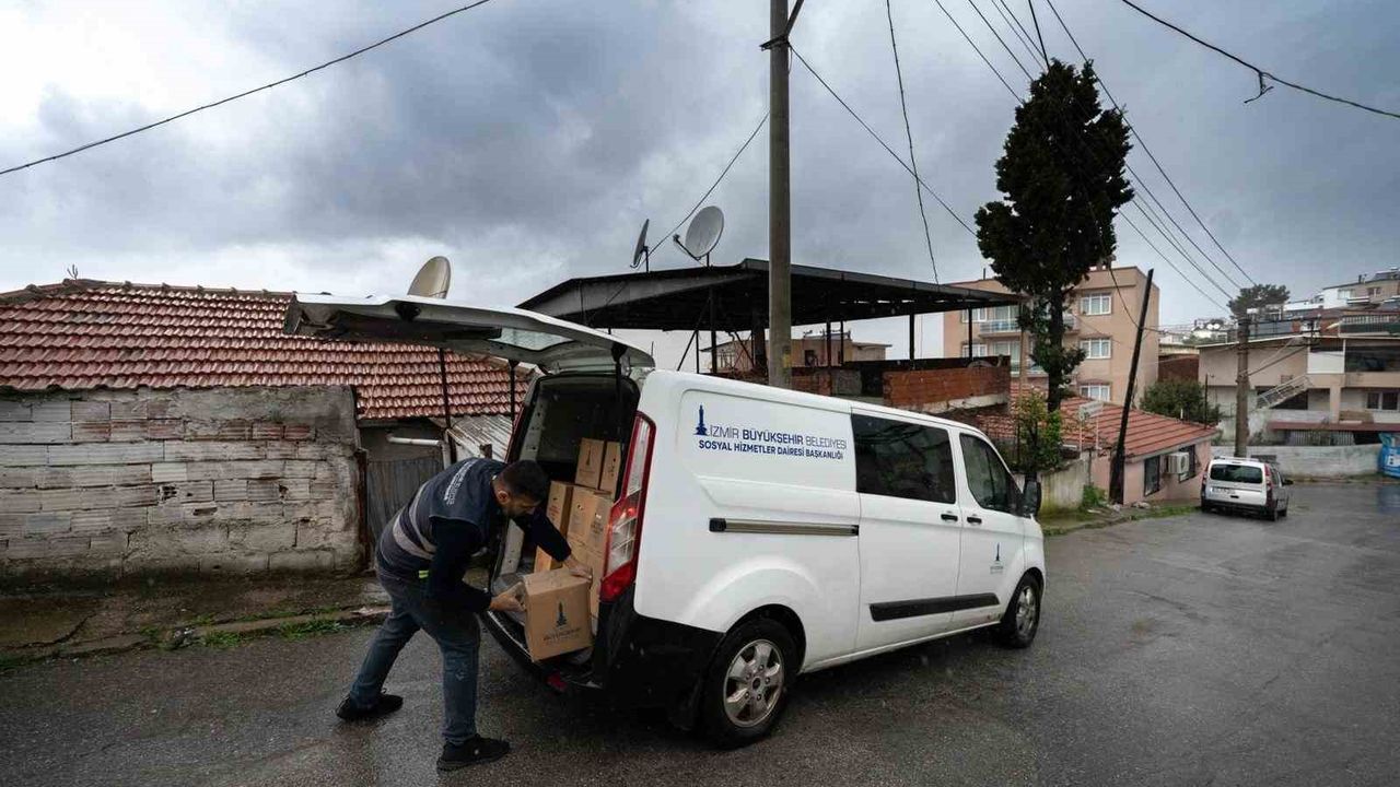 İzmir Büyükşehir Belediyesi'nin hanelere teslim ettiği paket içinde mercimek, pirinç, kuru fasulye, nohut, makarna, bulgur, salça, un, sıvı yağ, tuz, çay ve şeker yer aldı.