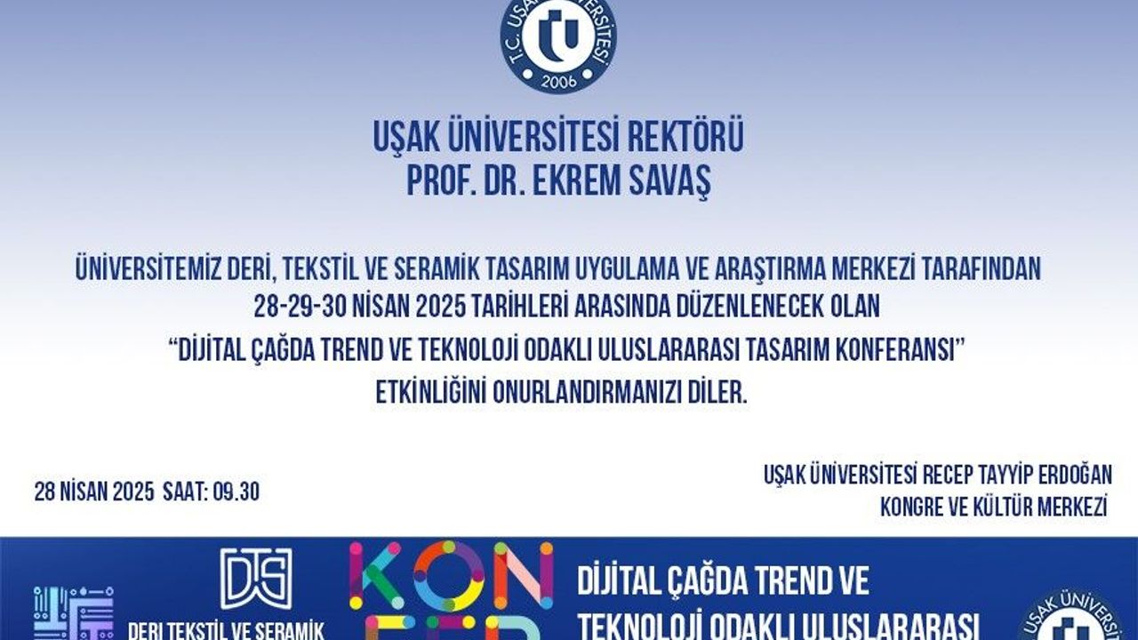 Uşak Üniversitesi Deri, Tekstil ve Seramik (DTS) Tasarım Uygulama ve Araştırma Merkezi, 28-29-30 Nisan 2025 tarihlerinde "Dijital Çağda Trend ve Teknoloji Odaklı Uluslararası Tasarım Konferansı" ile tasarım dünyasının nabzını tutacak. 3 gün sürecek konferansta, dijitalleşme ve trend odaklı dönüşüm süreci farklı yönleriyle ele alınacak.