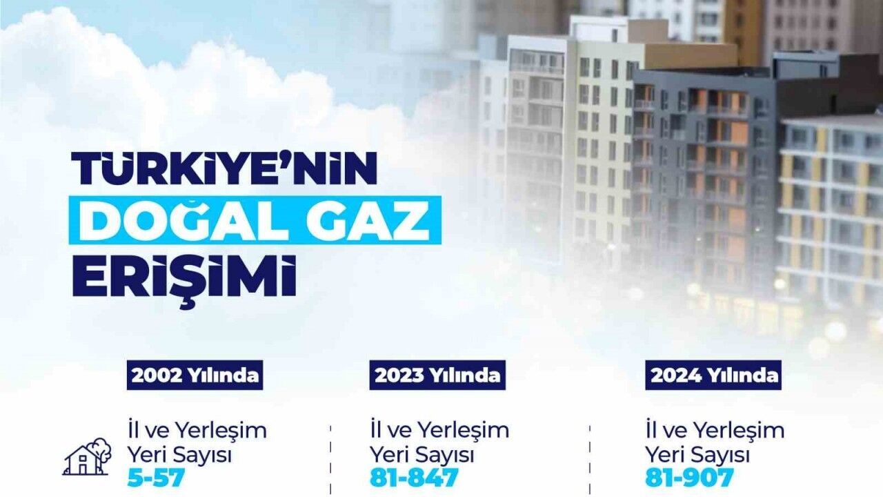 Enerji ve Tabii Kaynaklar Bakanlığından edinilen bilgilere göre; 2024 yılında 60 yerleşim yeri daha doğal gaz konforuyla tanıştı. Yıl sonu itibari ile yerleşim yeri sayısı 907’ye çıktı. 2025 yılında da şu ana kadar 6 yerleşim yerine doğal gaz verildi. Böylece doğal gaza erişimi olan yerleşim yeri sayısı 913’e ulaştı. 2025 yılı sonuna kadar toplam 96, 2026 yılında da 44 yerleşim yerine daha doğal gaz ulaştırılacak. Böylece, 2026 sonu itibarıyla bin 53 yerleşim yerinde doğal gaz kullanılacak.