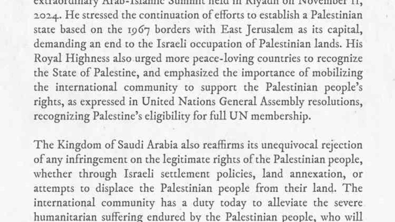 Suudi Arabistan yönetiminin başkenti Doğu Kudüs olan bağımsız bir Filistin devletinin kurulması için amansız çabalarını sürdüreceğini ve bu gerçekleşmeden İsrail ile diplomatik ilişkiler kurmayacağını daha önce vurguladığı hatırlatılan açıklamada, "Muhammed bin Selman ayrıca, 11 Kasım 2024’te Riyad’da düzenlenen olağanüstü Arap-İslam Zirvesi’nde bu kararlı tutumu yinelemiştir. Başkenti Doğu Kudüs olan 1967 sınırlarına dayalı bir Filistin devleti kurma çabalarının sürdürülmesi gerektiğini vurgulamış ve İsrail’in Filistin topraklarını işgaline son verilmesini talep etmiştir" denildi. Açıklamada ayrıca Muhammed bin Selman’ın "daha fazla barışsever ülkeyi Filistin Devleti’ni tanımaya çağırdığı" ve "Filistin halkının haklarını desteklemek için uluslararası toplumu harekete geçirmenin önemini vurguladığı" hatırlatıldı.