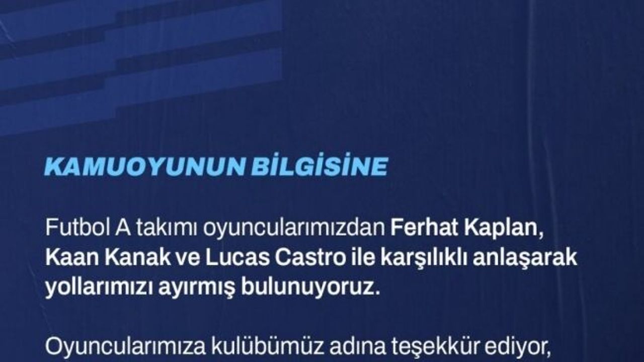 Mavi-lacivertli kulüpten yapılan açıklamada, "Futbol A takımı oyuncularımızdan Ferhat Kaplan, Kaan Kanak ve Lucas Castro ile karşılıklı anlaşarak yollarımızı ayırmış bulunuyoruz. Oyuncularımıza kulübümüz adına teşekkür ediyor, devam eden kariyerlerinde başarılar diliyoruz" denildi.
