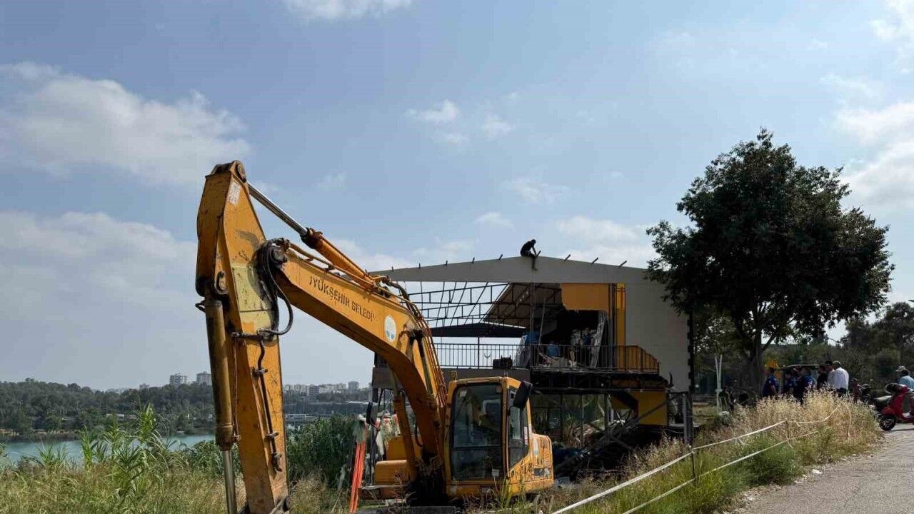 Adana Çevre Şehircilik ve İlkim Değişikliği İl Müdürlüğü tarafından 3 yılığına kiralanarak yapılan tesis belediye tarafından yıkılmak istenince işletme sahibi önce çatıya çıkıp daha sonrada iş makinelerinin önüne durarak yıkımı önlemeye çalıştı