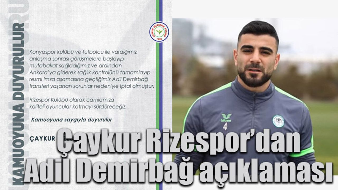 Çaykur Rizespor prensipte anlaşıp resmi imza aşamasına geldiği Konyaspor'un stoperi Adil Demirbağ'ın transferinden vazgeçtiğini duyurdu. Kulüp tarafından yapılan açıklama şöyle: "Konyaspor Kulübü ile profesyonel futbolcu Adil Demirbağ’ın transferi konusunda vardığımız anlaşma sonrası futbolcu ile görüşmelere başlayıp mutabakata vardık. Futbolcu Ankara’ya gelerek sağlık kontrolünü tamamlamasının ardından imza aşamasına geldiğimiz noktada Kulübümüzün dışında gelişen sorunlar nedeniyle futbolcunun transferi iptal olmuştur. Çaykur Rizespor Kulübü olarak camiamıza kaliteli oyuncular katmayı sürdüreceğiz. Kamuoyuna saygıyla duyurulur"