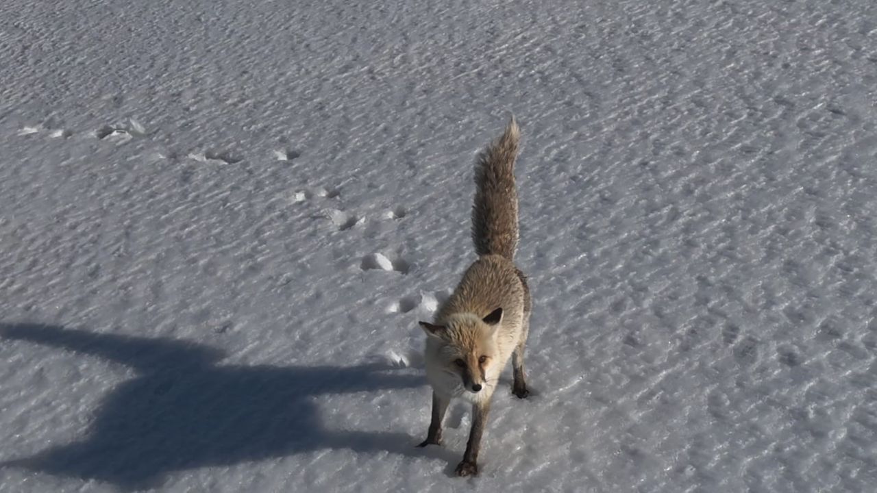 Bitlis'in Adilcevaz ilçesinde karla kaplanan doğada ilerleyen tilkinin drona verdiği tepki izleyenleri gülümsetti.