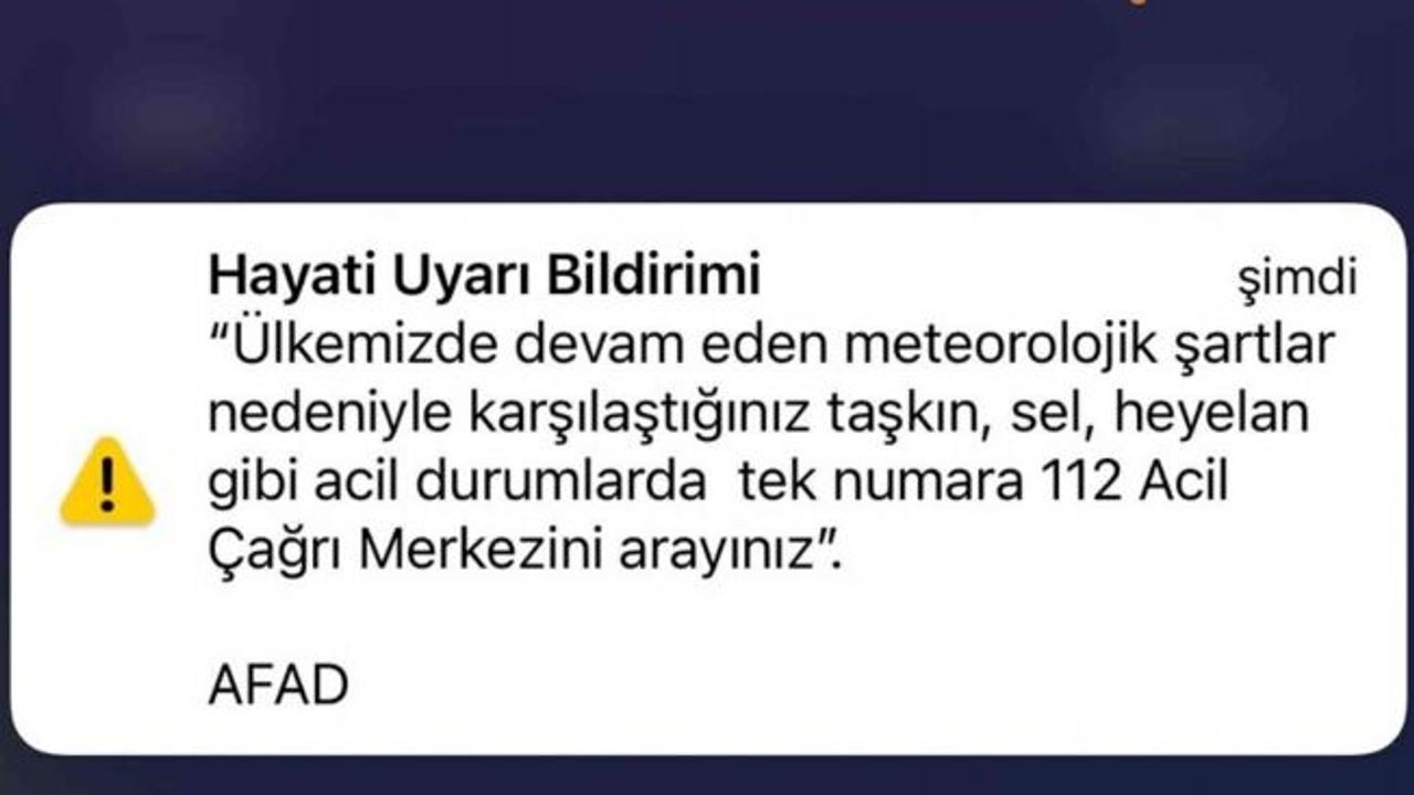 İçişleri Bakanlığı Afet ve Acil Durum Yönetimi Başkanlığı (AFAD) tarafından telefonlara "hayati uyarı bildirimi" gönderildi. Uyarıda, "Ülkemizde devam eden meteorolojik şartlar nedeniyle karşılaştığınız taşkın, sel, heyelan gibi acil durumlarda tek numara 112 Acil Çağrı Merkezi’ni arayınız" denildi.