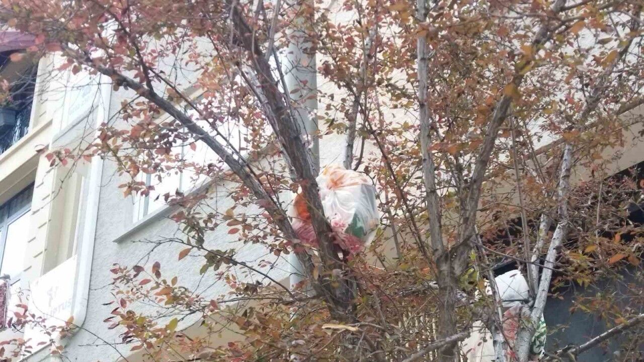 Eskişehir’deki bir cadde kenarındaki ağacın dallarında gözüken içi çöp dolu poşetler ilginçliğin yanı sıra kötü bir görüntü oluşturdu.