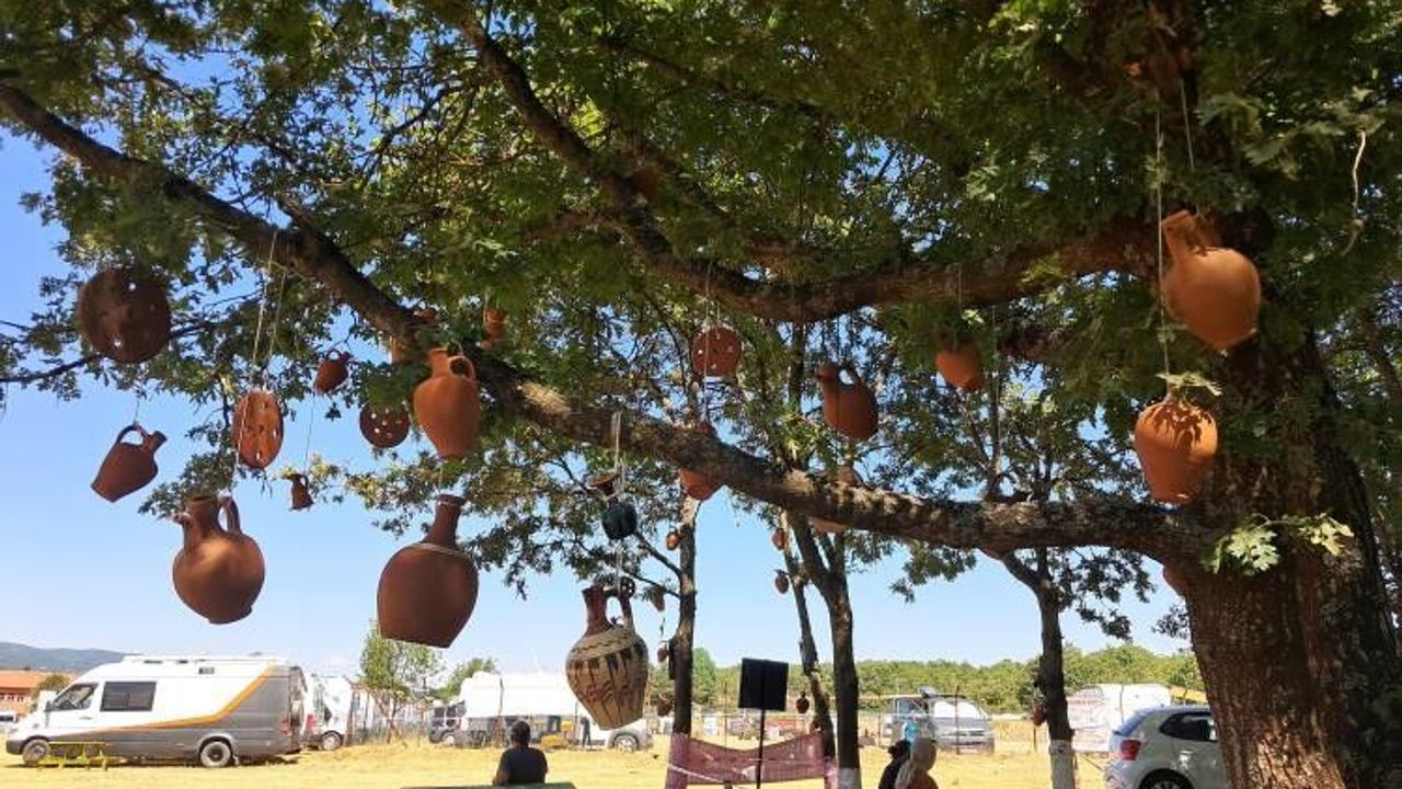 Türkiye’nin önemli çömlekçilik merkezlerinden biri olan köyde, bu kez alışılmışın dışında bir görüntü ortaya çıkarken, ağaçlar, çaput yerine çömlekle süslendi.