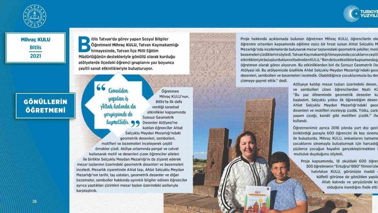 Milli Eğitim Bakanlığından (MEB) yapılan açıklamada, MEB Strateji Geliştirme Başkanlığınca yayımlanan "Maarifin Yüz Akı" e-dergisinde, yenilikçi çözümler üreten, hayal gücü sınır tanımayan öğrenci ve öğretmenlere ait başarı hikayeleri, fark oluşturan proje çalışmaları ve ilham verici uygulama örneklerinin yer aldığı belirtildi. Açıklamada, “Bakanlığın merkez ve taşra teşkilatı birimleri ile birlikte hareket edilerek toplam 10 binin üzerinde iyi uygulama incelendi. Türkiye’nin tüm illerinden, farklı branş ve kademelerden öğretmen kategorisinde 20, öğrenci kategorisinde 54 ve eğitim kurumları kategorisinde 26 çalışma olmak üzere toplam 100 iyi uygulama örneğine yer verildi. 2021 yılında Bitlis’in Tatvan ilçesinde görev yapan Sosyal Bilgiler Öğretmeni Mihraç Kulu’nun, kendi imkanlarıyla çocuklara yönelik çıkardığı ‘Ahlat Selçuklu Meydan Mezarlığı Rehber ve Etkinlik’ kitabı projesi de MEB Cumhuriyet’in 100. yılına özel ‘Maarifin Yüz Akı’ e-dergisindeki 20 başarılı örnek proje arasında yer aldı” denildi.