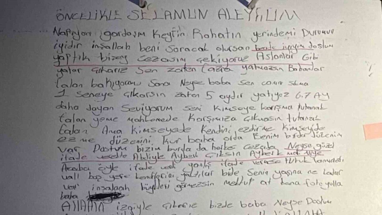 Sanık B.B. tarafından gönderilen mektupta, "Napıyon gardaşım, keyfin rahatın yerinde mi? Durumun iyidir inşallah. Beni soracak olursan iyiyim, yaptık bir şey cezasını çekiyoruz. Aslanlar gibi yatar çıkarız. Sen zaten fazla yatmazsın. Babanlar sana bakıyor mu? Neyse baba sen canını sıkma, 1 seneye çıkarsın. Zaten 5 aydır yatıyoruz. 6-7 ay daha dayan. Seviyorum seni. Kimseye karışma, tutanak yeme. Mahkemede karşımıza çıkmasın. Kimseye kendini ezdirme. Kimseyi de ezme. Kendi düzenini kur, benim burada düzenim var. Neyse güzel ifade verelim de Abdi’yle Ayberk çıksın. Ayberk yanlış ifade vermese tutuklanmazdı. Boş yere kendilerini yaktılar. Bana fotoğraf yolla. Allah’ın izniyle çıkarız. Kendine dikkat et, seviyorum seni" ifadeleri yer aldı.