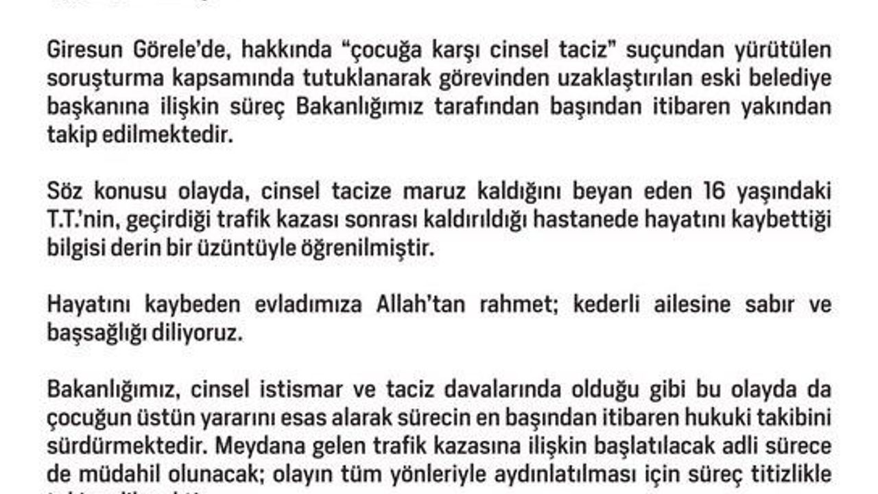 Aile ve Sosyal Hizmetler Bakanlığı, CHP'li eski Görele Belediye Başkanının tacizde bulunduğu iddia edilen 16 yaşındaki T.T.'nin geçirdiği trafik kazası sonucu hayatını kaybetmesine ilişkin açıklama yaptı. Bakanlığın sosyal medya hesabından yapılan açıklamada, 'Giresun Görele'de hakkında 'çocuğa karşı cinsel taciz' suçundan yürütülen soruşturma kapsamında tutuklanarak görevinden uzaklaştırılan eski belediye başkanına ilişkin süreç Bakanlığımız tarafından başından itibaren yakından takip edilmektedir. Söz konusu olayda cinsel tacize maruz kaldığını beyan eden 16 yaşındaki T.T.'nin geçirdiği trafik kazası sonrası kaldırıldığı hastanede hayatını kaybettiği bilgisi derin bir üzüntüyle öğrenilmiştir. Hayatını kaybeden evladımıza Allah'tan rahmet; kederli ailesine sabır ve başsağlığı diliyoruz. Bakanlığımız, cinsel istismar ve taciz davalarında olduğu gibi bu olayda da çocuğun üstün yararını esas alarak sürecin en başından itibaren hukuki takibini sürdürmektedir. Meydana gelen trafik kazasına ilişkin başlatılacak adli sürece de müdahil olunacak, olayın tüm yönleriyle aydınlatılması için süreç titizlikle takip edilecektir. Çocuklara yönelik her türlü istismar ve ihmal karşısında sıfır tolerans anlayışımızla hareket etmeye kararlılıkla devam edeceğimizi bir kez daha vurguluyoruz' ifadelerine yer verildi.
