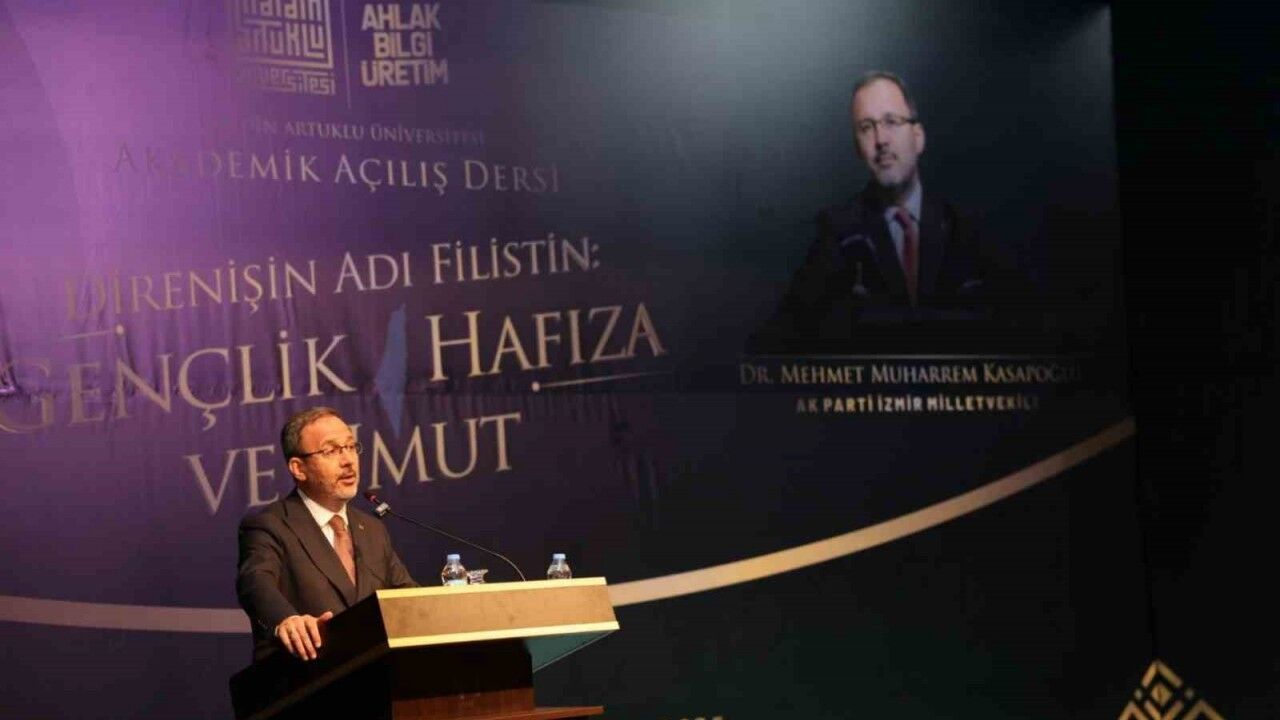 AK Parti İzmir Milletvekili Mehmet Muharrem Kasapoğlu, Mardin Artuklu Üniversitesi’nde gerçekleştirilen 2025-2026 Akademik Yılı Açılış Dersi’nde gençlere hitap etti. "Direnişin Adı Filistin: Gençlik, Hafıza ve Umut" başlığıyla düzenlenen programda konuşan Kasapoğlu, "Filistin davasını konuşmak, sadece bir coğrafyanın değil, insanlık onurunun davasını konuşmaktır. Ben bu dersi bir yönelişin adı olarak görüyorum. Hangi değerlerle yola çıktığımız ve hangi kavramları zihnimizde taşıdığımız; mazlumun yanında durma irademizi, adalet ve vicdan ekseninde kurduğumuz insanlık çizgisini belirler" ifadelerini kullandı.