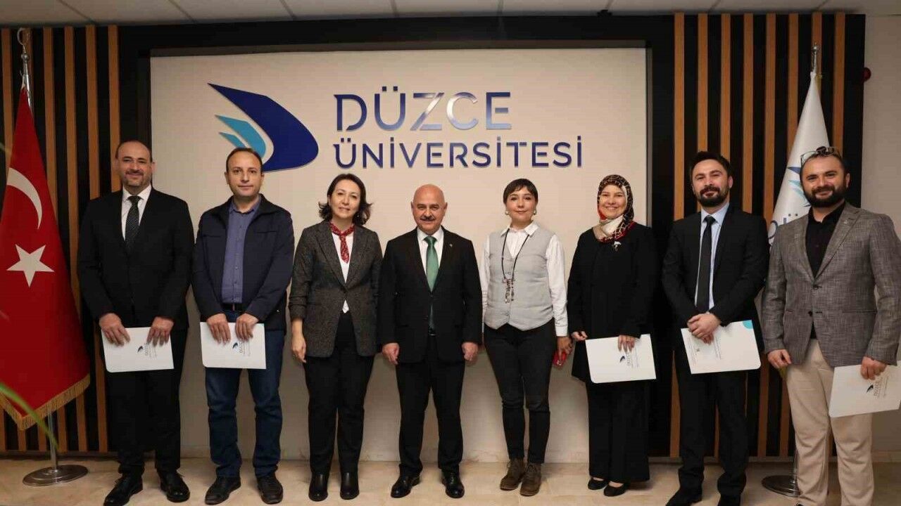 Rektörlük makamında gerçekleştirilen belge takdim törenine; Düzce Üniversitesi Rektörü Prof. Dr. Nedim Sözbir, Rektör Yardımcısı Prof. Dr. Ali Öztürk, Araştırma Dekanı Prof. Dr. Emine Tekin, Araştırma Dekan Yardımcısı Doç. Dr. Aysun Aydın ile başarı belgesi almaya hak kazanan Düzce Üniversitesi öğretim üyeleri katıldı.