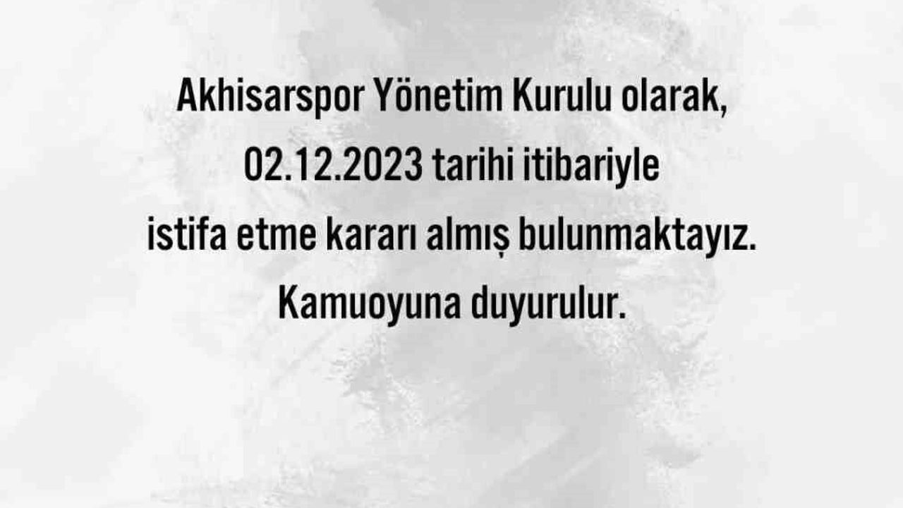 Yapılan açıklamada, "Akhisarspor Yönetim Kurulu olarak, 02.12.2023 tarihi itibarıyla istifa etme kararı almış bulunmaktayız. Kamuoyuna duyurulur" ifadelerine yer verildi.