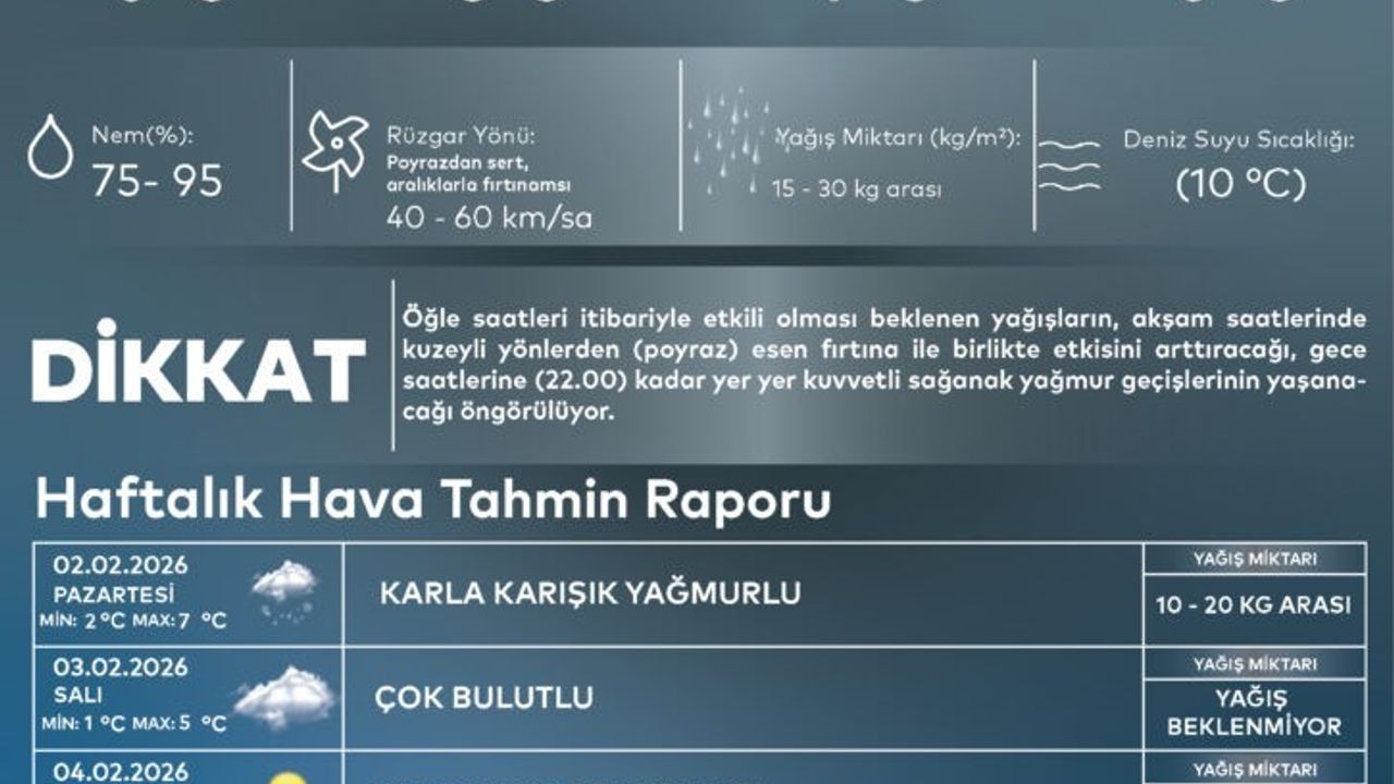 Afet İşleri ve Risk Yönetimi Daire Başkanlığı (AKOM), megakent İstanbul için bugün öğle saatleri itibarıyla yağışın akşam saatlerinden itibaren poyraz rüzgarlarıyla beraber fırtınayla beraber etkisini arttıracağını duyurdu. Ayrıca AKOM, 2 Şubat Pazartesi günü için ise hava sıcaklığının en düşük 2 derece, en yüksek 7 derece olmasıyla beraber, karla karışık yağmurlu havanın etkili olacağı bilgisini paylaştı.