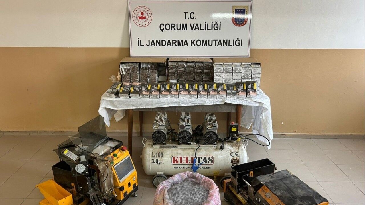 Çorum’un Alaca ilçesinde jandarma ekipleri tarafından yasa dışı sigara imalatı yapıldığı belirlenen adreste yapılan aramda on binlerce makaron ve çok sayıda tütün sarma makinesi ele geçirildi.