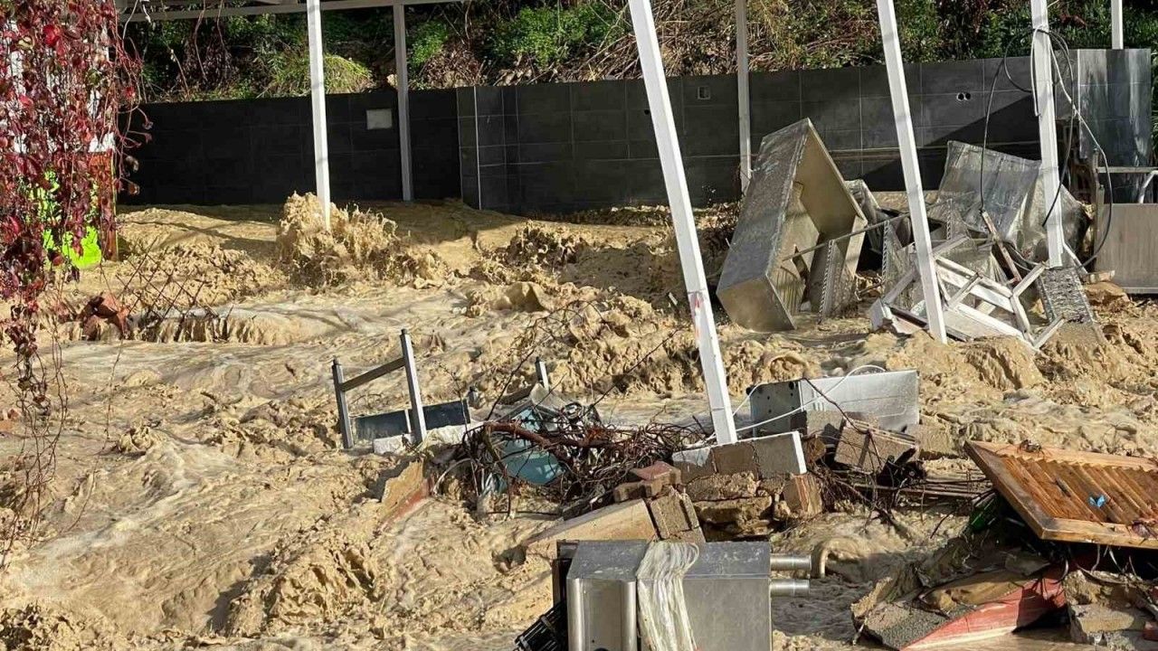 Alanya’nın İncekum Mahallesi’nde bugün öğle saatlerinde etkili olan sağanak, D-400 karayolunun kısa süre ulaşıma kapanmasına sebep oldu. Bölgedeki Ölükler Deresi de şiddetli yağmur nedeniyle taştı. Taşan derenin suları, sahilde 5 yıldızlı bir otele ait olan ve açılışa hazırlanan kafeyi adeta yerle bir etti. Kafedeki ocak, dolap gibi malzemeler suyla sürüklenerek ortalığa saçılırken, dereden taşan sular sahildeki kumları da denize taşıdı. Dereden taşan suyun sahil ve kafeye verdiği zarar cep telefonu ile görüntülendi.