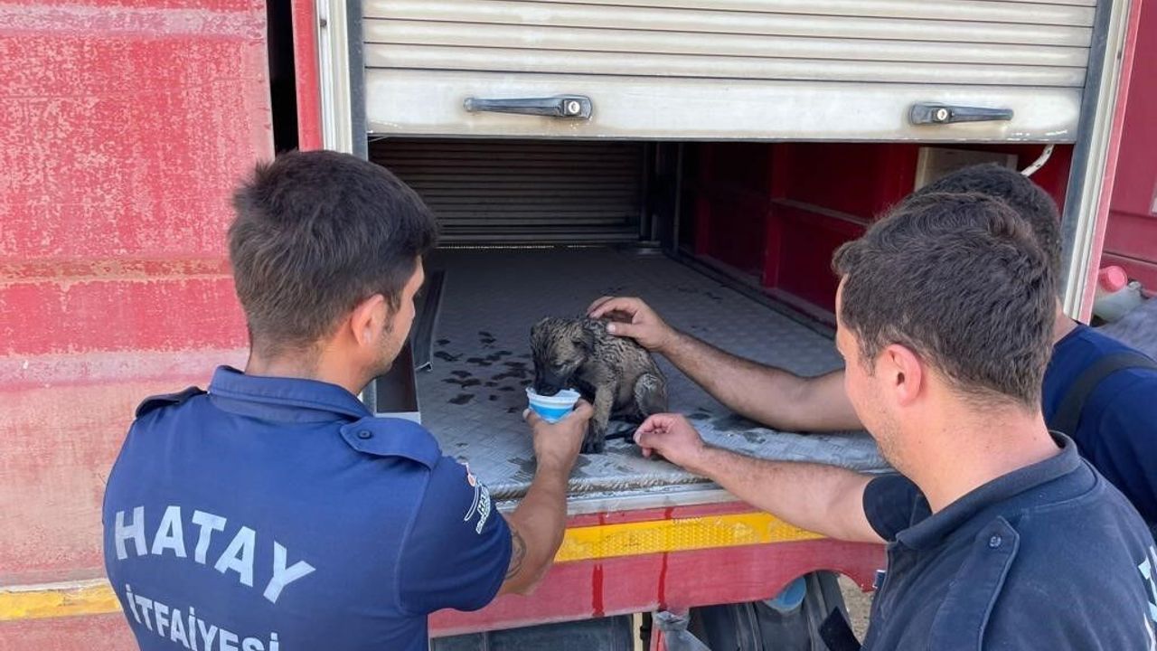 Hatay’ın Antakya ilçesinde otluk alanda çıkan yangında alevler arasında kalan yavru köpek, itfaiye ekipleri tarafından yanmaktan son anda kurtarıldı.
