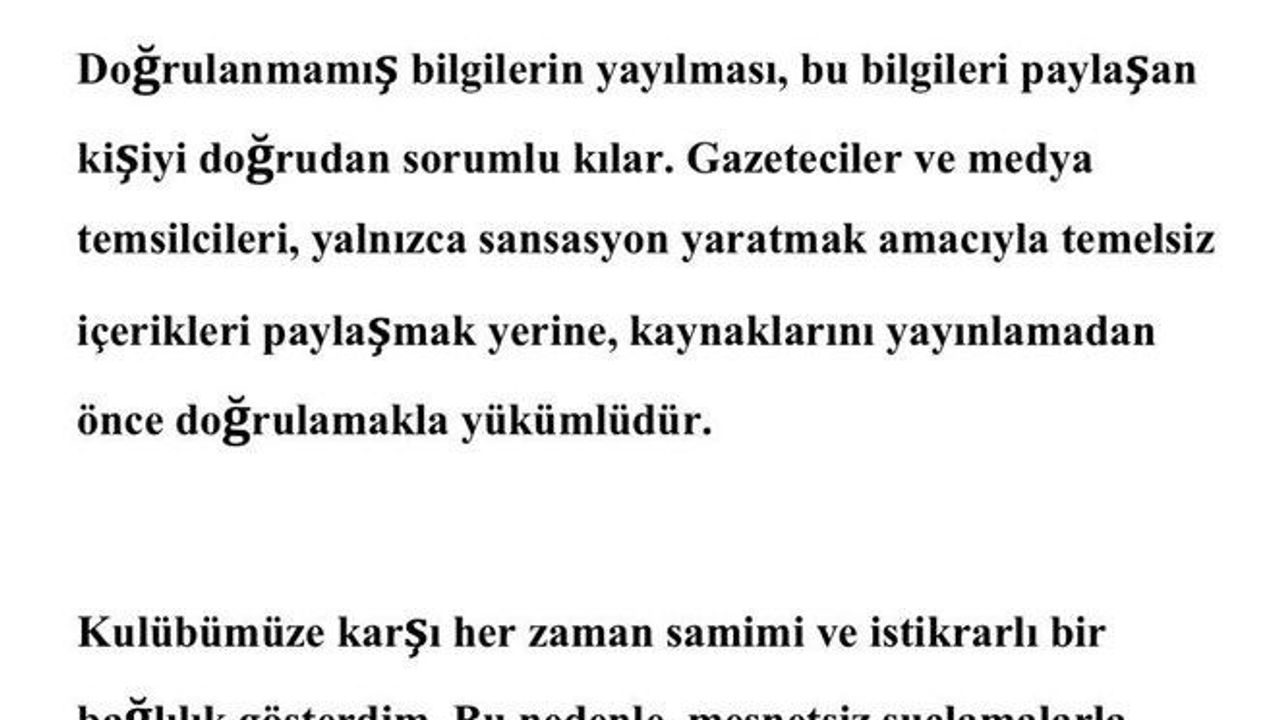 Kulübümüze karşı her zaman samimi ve istikrarlı bir bağlılık gösterdim. Bu nedenle mesnetsiz suçlamalarla adamın lekelendiğini görmek kabul edilemez. Haklarımı korumak adına her türlü hukuki girişimde bulunma hakkımı saklı tutuyorum" ifadelerine yer verdi.