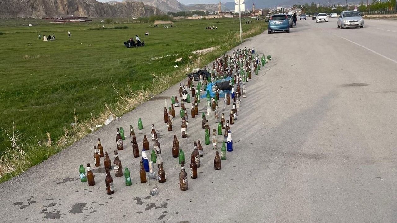 Tarihi ve doğal güzellikleriyle bilinen Van Kalesi çevresine gelişigüzel atılan yüzlerce cam şişe, çevre gönüllüsü Yavuz Taşoğlu’nun tepkisine neden oldu. Piknik için ailesiyle bölgeye gelen Taşoğlu, eline poşet alarak çevredeki atıkları toplamaya başladı. Topladığı onlarca alkol şişesini ise dikkat çekmek amacıyla kaldırım kenarına dizdi.
