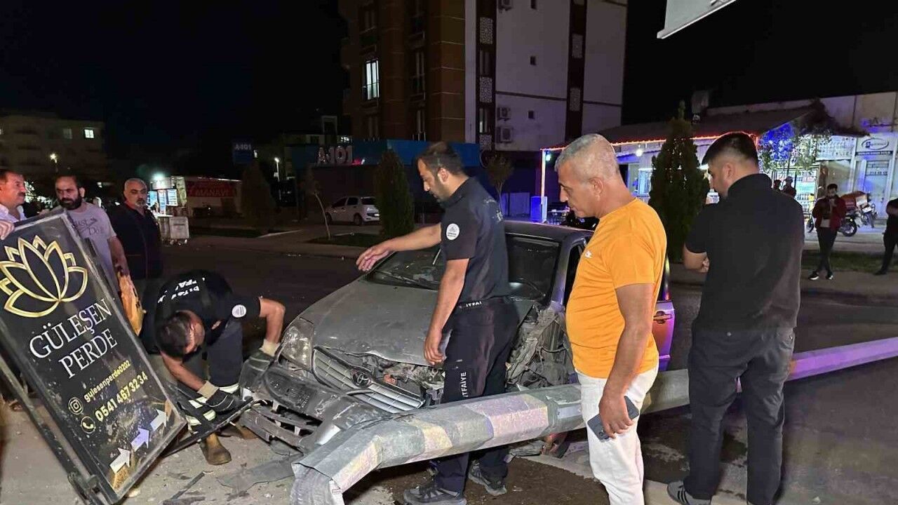 Adıyaman’da alkollü olduğu öğrenilen sürücünün kullandığı otomobil aydınlatma direğini devirerek refüje çıktı.