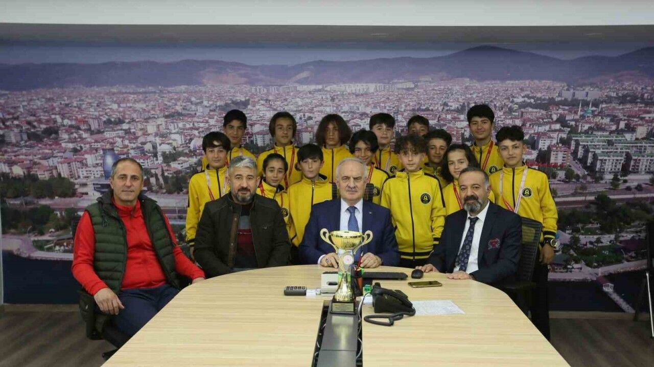 Derince Alparslan Ortaokulu öğrencileri Efe Uzel, Berat Erdin, Yusuf Bilgin, Yusuf Cem Kotan, Alperen Ayyıldız, Çınar Erkal, Doruk Kıvanç Ay, Uğur Baba, Yiğit Ali Özer, Umut Kaçmaz, Mehmet Sarım, Ayaz Yıldız, Kerem Uygur, Mert Açıkgöz, Mehmet Eymen Kabataş, antrenörleri Kamuran Yalçın, Tuncay Budakin ve okul müdürü Hakan Öztürk, şampiyonluk kupası ile birlikte Başkan Aygün’ü ziyaret etti. Eğitime ve spora olan desteklerinin süreceğini belirten Aygün, başarılarından dolayı öğrencilere hediye takdiminde bulundu.
