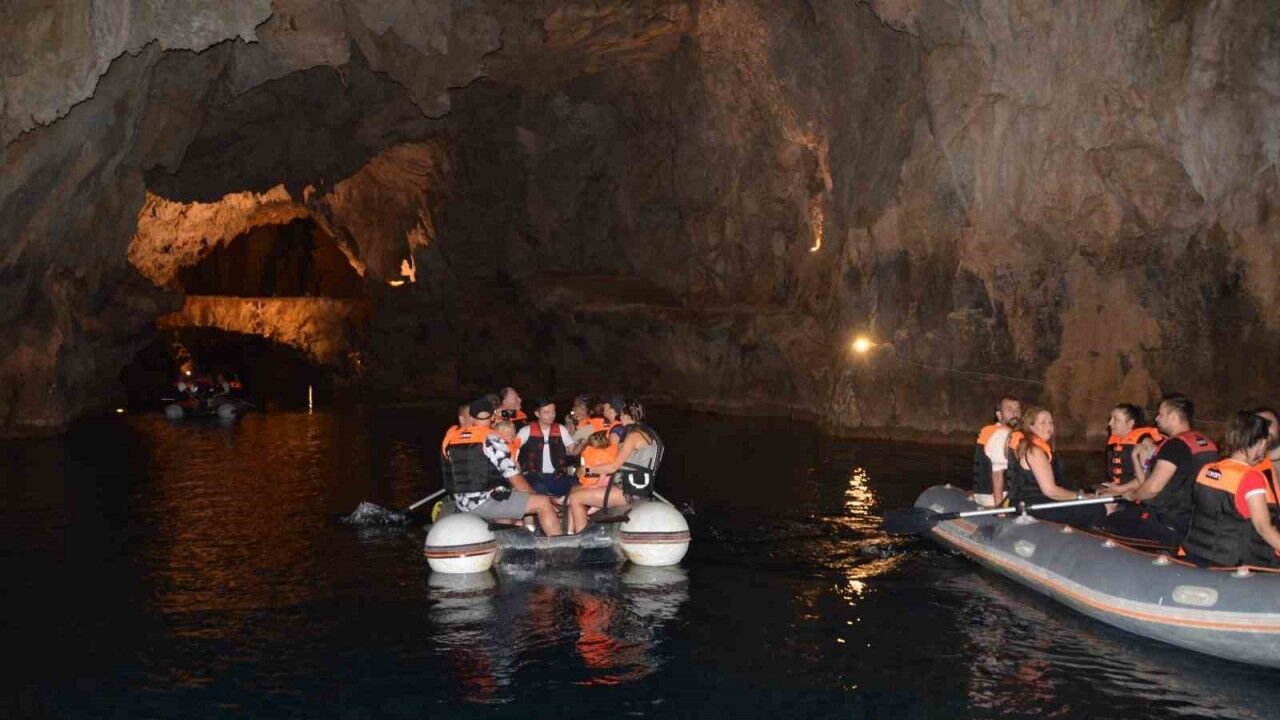 Antalya’nın İbradı ilçesi Ürünlü Mahallesi sınırları içerisinde bulunan, dünyanın 3’üncü, Türkiye’nin ise en büyük yeraltı gölü mağarası özellikle bayram tatilinde ziyaretçi akınına uğradı. 9 günlük kurban bayramı tatilinde 10 bin kişinin ziyaret ettiği mağarayı ortalama bir günde bin 100 kişi ziyaret etti. Turkuaz renkteki suyun üzerinde gezi botları ile mağaranın güzelliklerini keşfe çıkan yerli ve yabancı ziyaretçiler, Antalya’nın bu cennet köşesine hayran kaldı.
