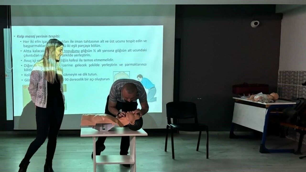 Eğitmen Uzman Hemşire Gülcan Okumuş tarafından İstanbul Ticaret Odası Şehit Süleyman Turan Anadolu Lisemizin konferans salonunda verilen ilk yardım kursuna, İlçe Milli Eğitim Müdürü İsmail Özden, Halk Eğitim Müdürü Salim Teoman Okuş ve Şube Müdürü Serdar Koyuncu katılım sağlayarak süreci yerinde incelediler.