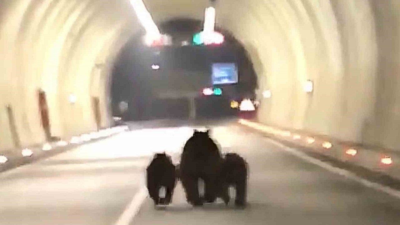 Aç kaldığı için şehre indikleri düşünülen ayılar ise 1100 metre uzunluktaki tüneli koşarak geçti. Görüntülerde, tünelin bir ucundan diğer ucuna kadar koşması nedeniyle yorulan ayıların durup arkasındaki araca bakmaları ve yollarına devam etmeleri de yer aldı.