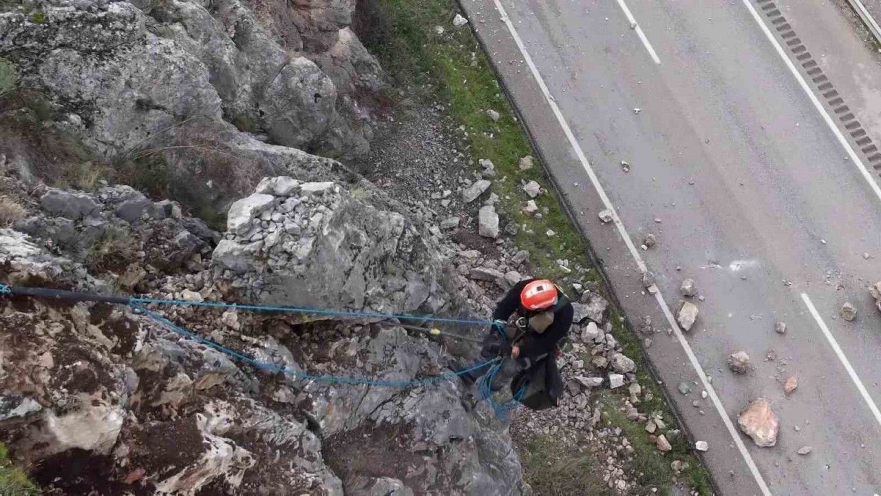 Amasya’da dik yamaçlardan yola düşme riski bulunan kaya parçaları yerinden söküldü. Dağcı ekibin ellerindeki levyelerle yerinden oynattığı kaya parçaları bir bir yere düşürüldü. O anlar dronla görüntülendi.