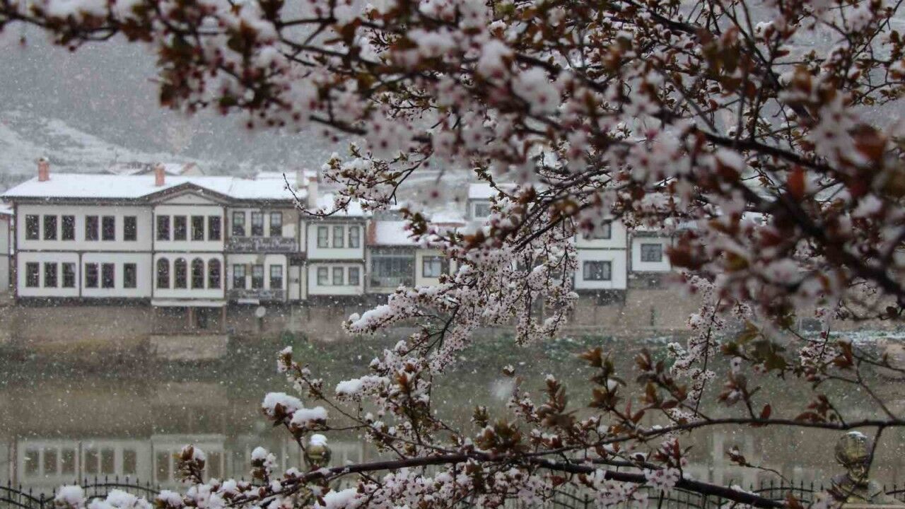 Amasya’ya mart ayında erken açan ağaçların çiçekleri karla kaplandı.