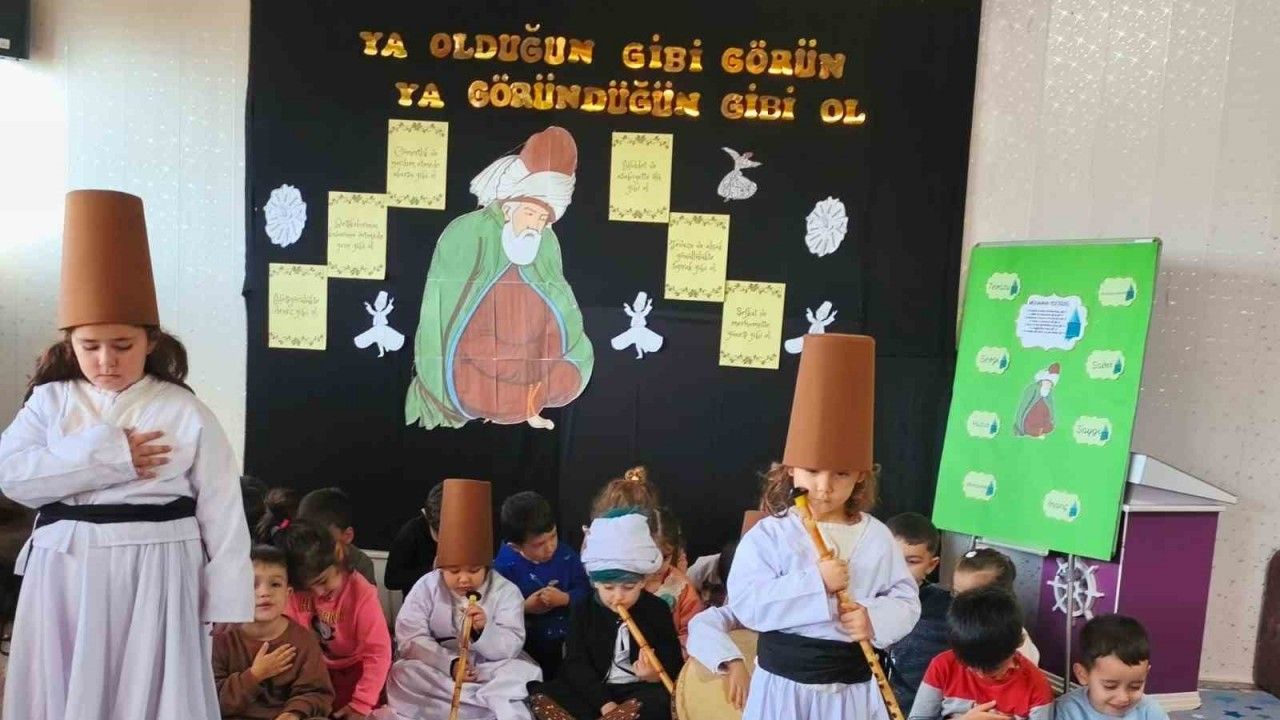 Anamur İlçe Müftülüğüne bağlı Değirmencik Burnu, Müberra Mert ve Yunus Emre 4-6 Yaş Kur’an Kursları tarafından düzenlenen etkinlikte minik öğrenciler, Mevlana’nın hoşgörü, sevgi ve birlik temalı öğretilerini yaşlarına uygun bir dille öğrendi.