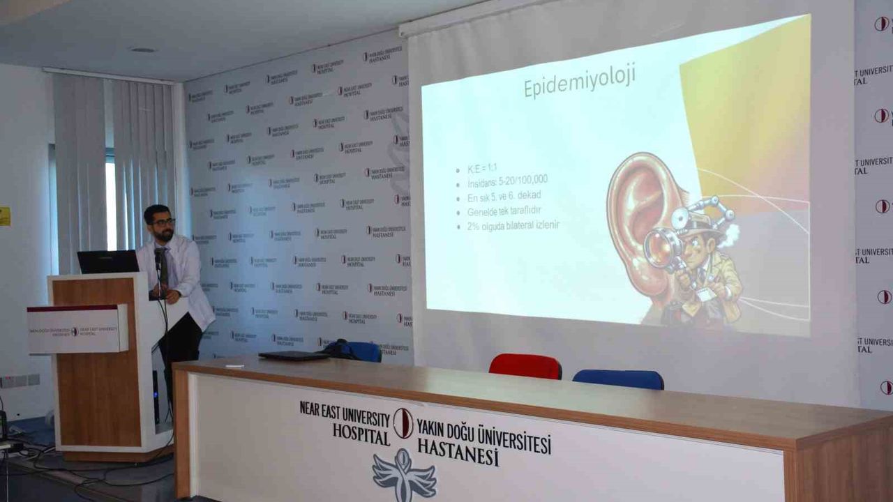 Yakın Doğu Üniversitesi Tıp Fakültesi Kulak Burun Boğaz Hastalıkları Anabilim Dalı'nda uzmanlık eğitimine devam eden Asist. Dr. Cemal Bartu Bektaş tarafından verilen konferansın moderatörlüğünü Yakın Doğu Üniversitesi Tıp Fakültesi Dekanı Prof. Dr. Gamze Mocan ile Tıp Fakültesi Sürekli Tıp Eğitimi Koordinatörü Prof. Dr. Emrah Ruh üstlendi. Yakın Doğu Üniversitesi Hastanesi'nde gerçekleşen konferans sağlık alanında çalışan akademisyenler ve hekimler tarafından ilgiyle takip edildi. Ani işitme kaybının klinik özellikleri, hastalığın ortaya çıkışında etkili olabilecek faktörler, tanı sürecinde dikkat edilmesi gereken noktalar ve güncel tedavi yaklaşımlarının ele alındığı konferansta erken tanı ve zamanında müdahalenin tedavi başarısı üzerindeki belirleyici rolüne dikkat çekildi.