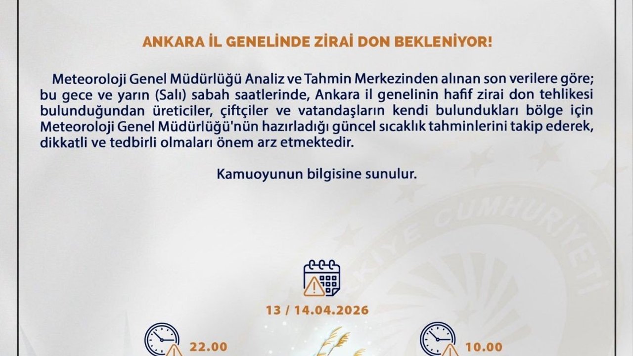 Açıklama, 'Meteoroloji Genel Müdürlüğü Analiz ve Tahmin Merkezinden alınan son verilere göre; bu gece ve yarın (Salı) sabah saatlerinde, Ankara il genelinin hafif zirai don tehlikesi bulunduğundan üreticiler, çiftçiler ve vatandaşların kendi bulundukları bölge için Meteoroloji Genel Müdürlüğü'nün hazırladığı güncel sıcaklık tahminlerini takip ederek, dikkatli ve tedbirli olmaları önem arz etmektedir' ifadelerine verildi.