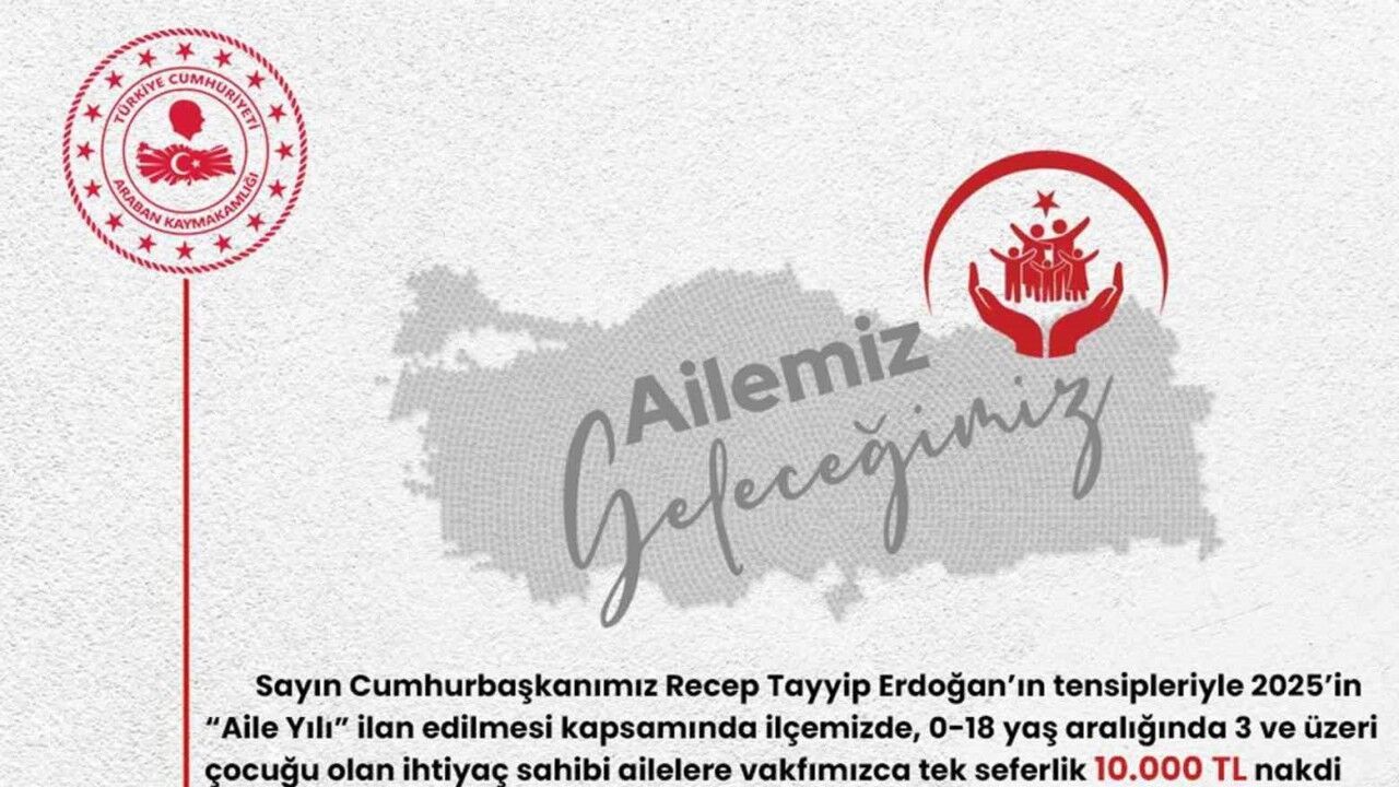 Gaziantep Araban Kaymakamlığı, Cumhurbaşkanı Recep Tayyip Erdoğan’ın 2025 yılını ’aile yılı’ ilan etmesinin ardından 0-18 yaş arası 3 ve üzeri çocuğu ailelere tek seferlik 10 bin TL nakdi yardım yapılacağını açıkladı. Araban Kaymakamı Özgür İşçimen, "Cumhurbaşkanımız Recep Tayyip Erdoğan’ın tensipleriyle 2025’in aile yılı ilan edilmesi kapsamında ilçemizde 0-18 yaş aralığında 3 ve üzeri çocuğu olan ihtiyaç sahibi ailelere vakfımızca tek seferlik 10 bin TL nakdi yardım yapılacaktır. Başvuru yapmak isteyen vatandaşlarımızın 24 Nisan-9 Mayıs 2025 tarihleri arasında Kaymakamlığımız Sosyal Yardımlaşma ve Dayanışma Vakfı’na bizzat müracaat etmeleri gerekmektedir" ifadelerini kullandı.