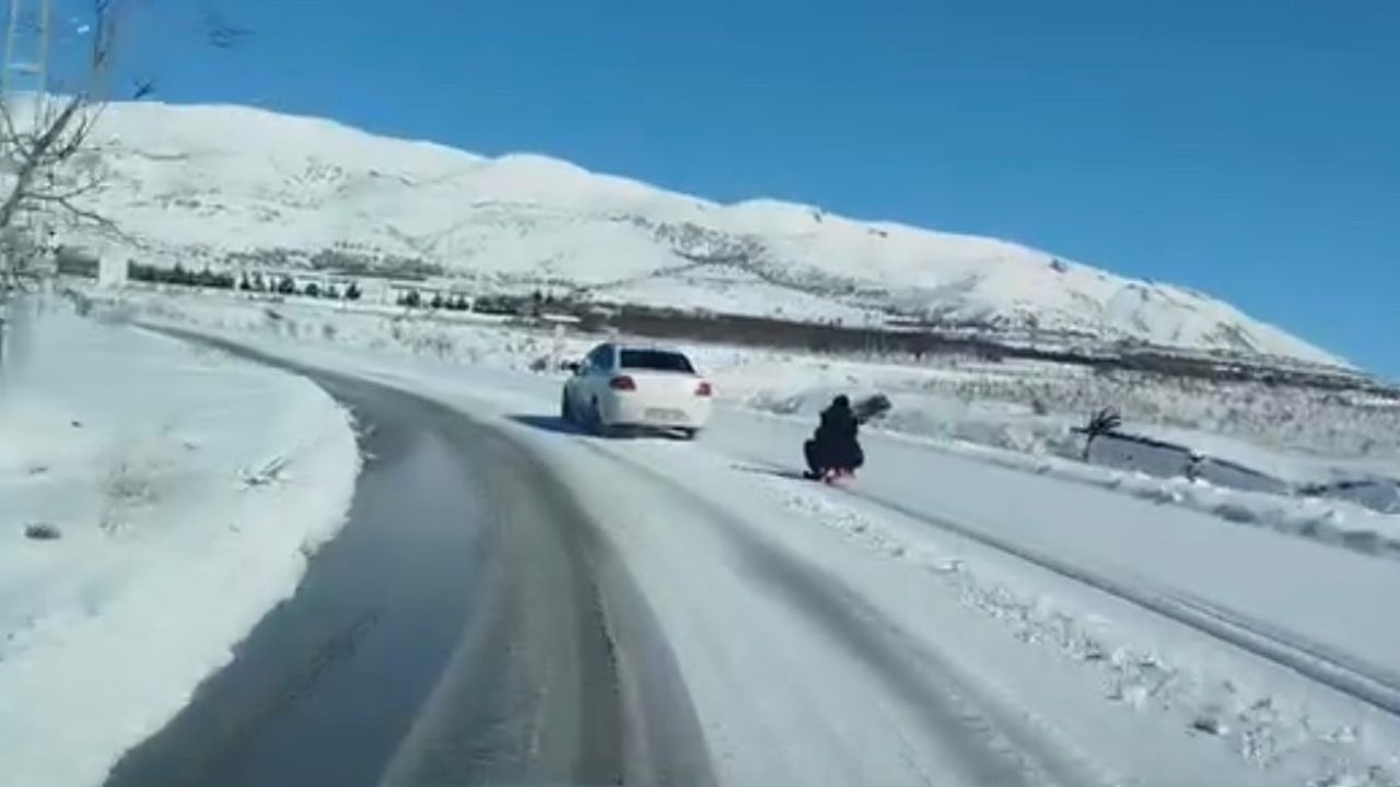 Elazığ'da bir şahıs, aracına bağladığı kızağı metrelerce çekti. Tehlikeli eğlence kameralara yansıdı.