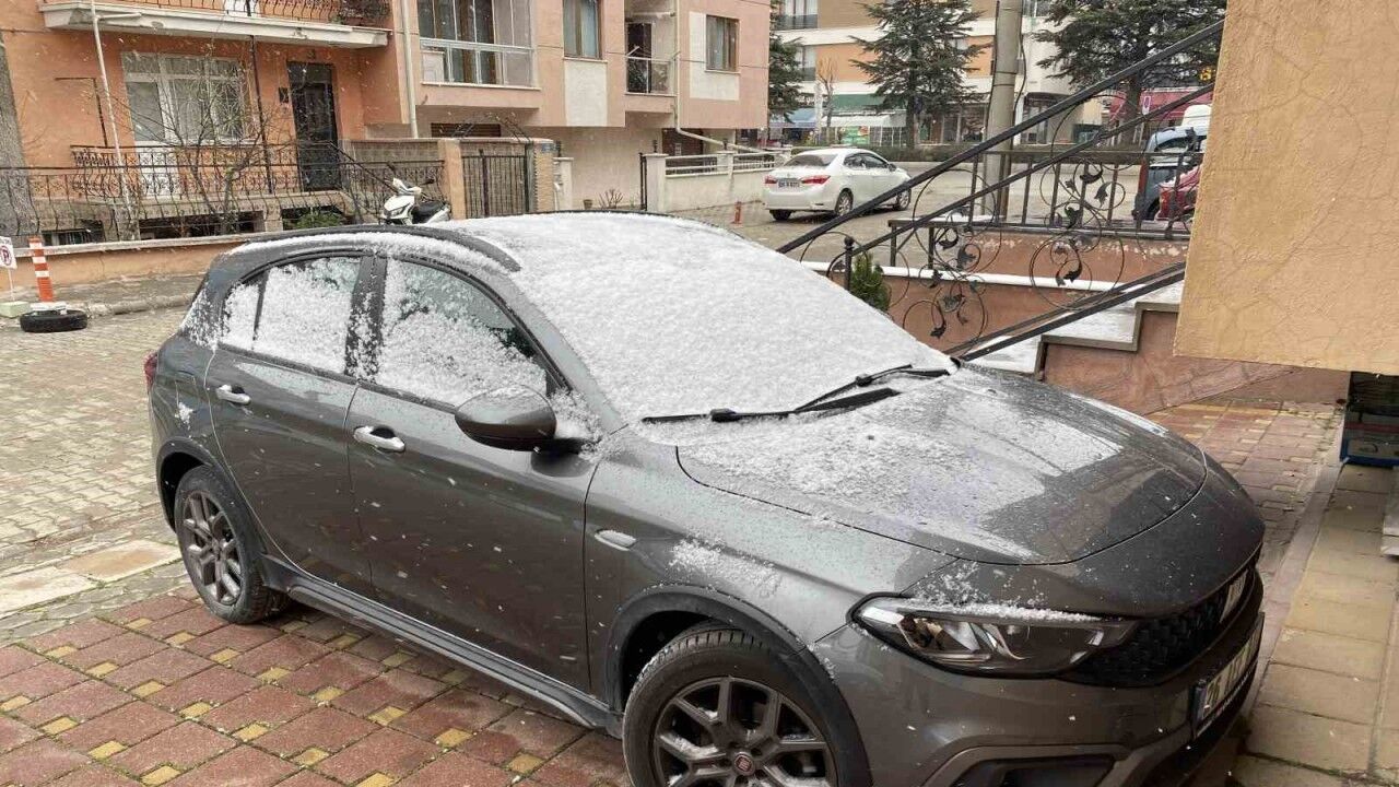 Eskişehir’de etkili olan yağış sonucunda araçların ve binaların üstünde kar birikintileri oluştu.