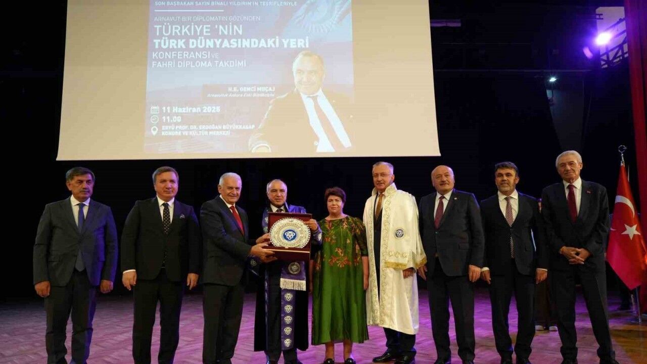 Erzincan Binali Yıldırım Üniversitesi (EBYÜ), Arnavutluk’un Eski Türkiye Büyükelçisi Genji Mucaj’a fahri doktora unvanı takdim etti. Törende, Türk Devletleri Teşkilatı (TDT) Aksakallar Konseyi Başkanı ve Türkiye Cumhuriyeti eski Başbakanı Binali Yıldırım da yer aldı.