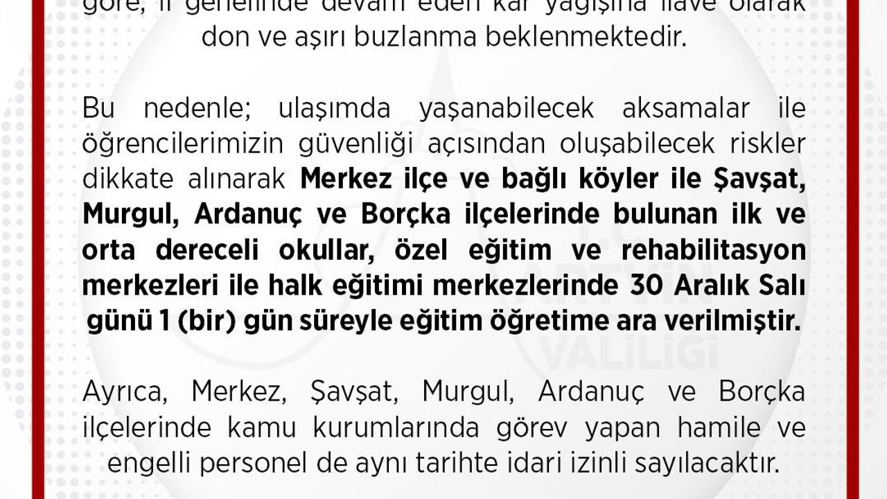 Artvin Valiliği'nden yapılan açıklamada, Meteoroloji İl Müdürlüğü'nden alınan değerlendirmelere göre il genelinde devam eden kar yağışına ilave olarak don ve aşırı buzlanma beklendiği belirtildi. Ulaşımda yaşanabilecek aksamalar ile öğrencilerin güvenliği göz önünde bulundurularak; Artvin merkez ilçe ve bağlı köyler ile Şavşat, Murgul, Ardanuç ve Borçka ilçelerinde bulunan ilk ve orta dereceli okullar, özel eğitim ve rehabilitasyon merkezleri ile halk eğitim merkezlerinde 30 Aralık Salı günü eğitim öğretime bir gün süreyle ara verildi.