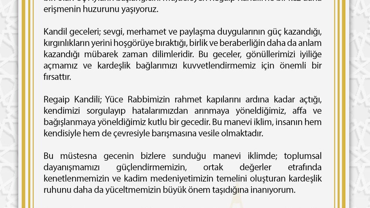 Mesajda, Regaip Kandili'nin; birlik, beraberlik ve yardımlaşma duygularının pekişmesine vesile olması gerektiği vurgulandı.