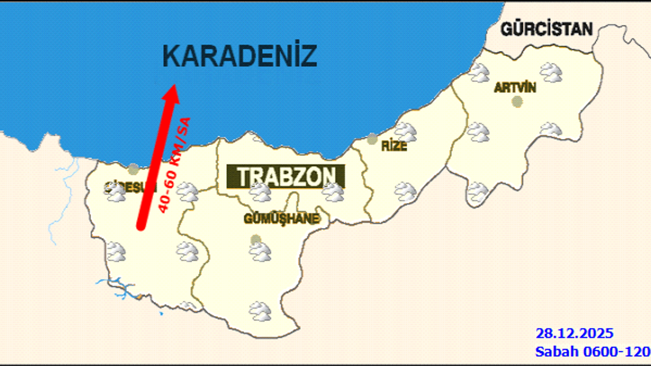 MGM Artvin Hava Durumu tarafından yapılan uyarıya göre, Doğu Karadeniz'de rüzgarın 28 Aralık Pazar sabah saatlerinden itibaren batı ve güneybatıdan, öğle saatlerinden sonra 29 Aralık Pazartesi gece saatlerine kadar Giresun ve Trabzon'un batı kesimlerinde batı ve kuzeybatıdan 7 ila 9 kuvvetinde (75-90 km/saat) kuvvetli fırtına şeklinde eseceği açıklandı. Fırtınanın Rize ve Artvin'i kapsayan doğu kesimlerinde 30 Aralık Salı öğle saatlerinden sonra, batı kesimlerinde ise 31 Aralık Çarşamba günün ilk saatlerinde etkisini kaybetmesi bekleniyor.